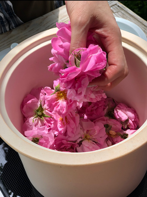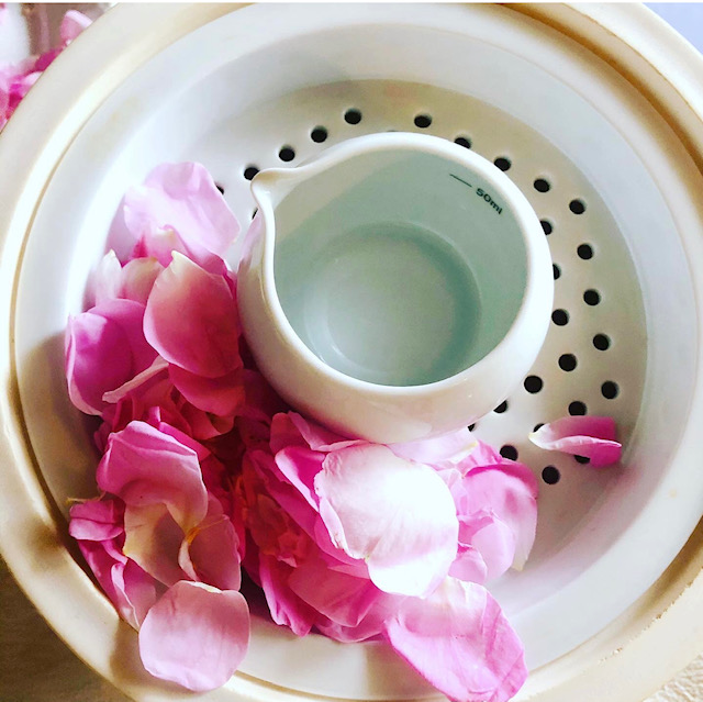 私はバラの季節、キッチンで小さな蒸留器を使い、フレッシュダマスクローズを「キッチン蒸留」しています。
